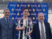 北京时间4月6日,在意甲第31轮尤文图斯主场迎战热那亚的比赛开始前,斑马军团的前锋凯南-伊尔迪兹领取了意甲3月最佳新星的奖杯,并与俱乐部主席詹卡洛-费雷罗和CEO达米安-科莫利合影。现年20岁的伊尔迪